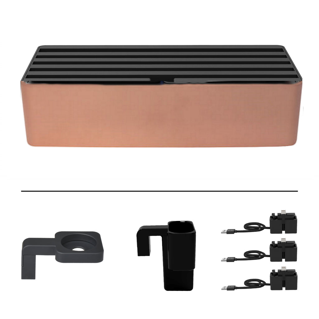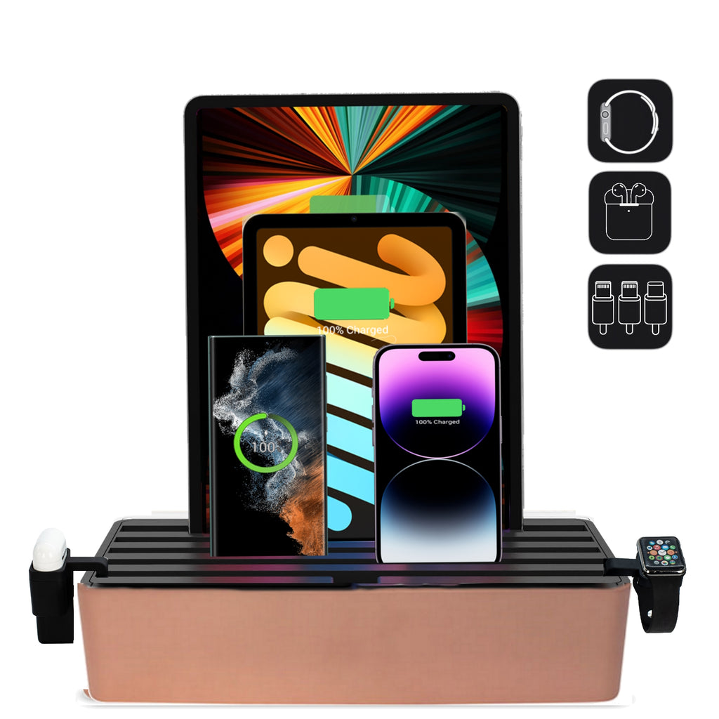 The ALLDOCK Classic Family Alu Rose Gold & White is a charger and docking station in one. The design is timelessly beautiful and all charging cables are hidden inside the ALLDOCK. Even large tablets can be docked and charged safely. In addition, the 6-port charger can be expanded with additional charging cables.