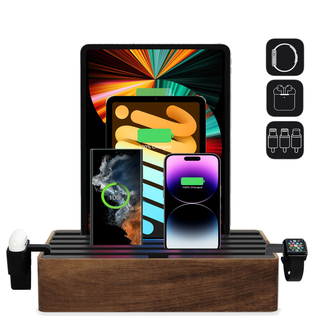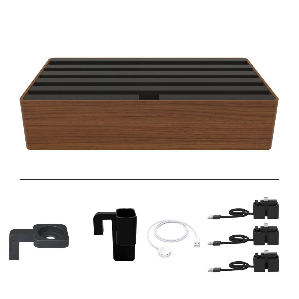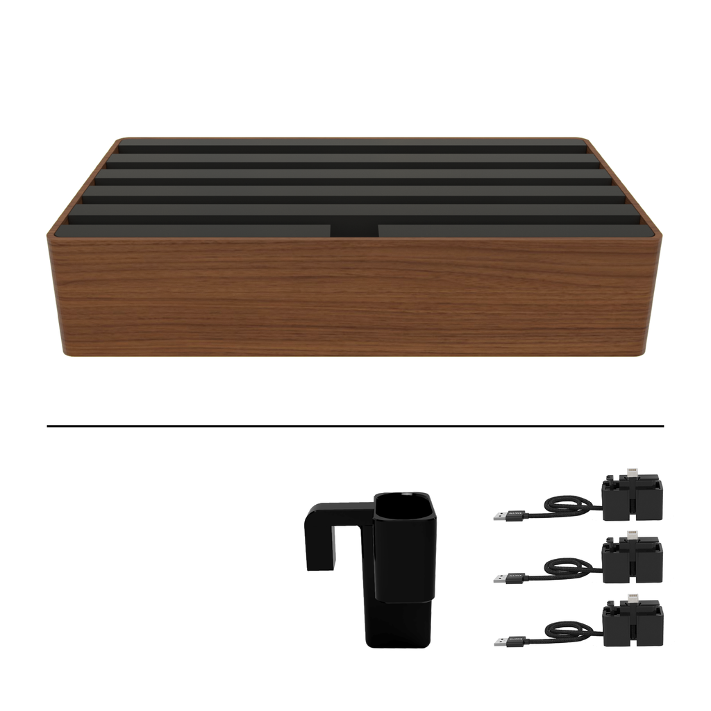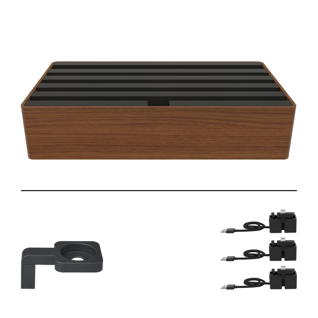 The ALLDOCK Classic Family Natural FSC Walnut & Soft to Touch Black is a charger and docking station in one. The design is timelessly beautiful and all charging cables are hidden inside the ALLDOCK. Even large tablets can be docked and charged safely. In addition, the 6-port charger can be expanded with additional charging cables.