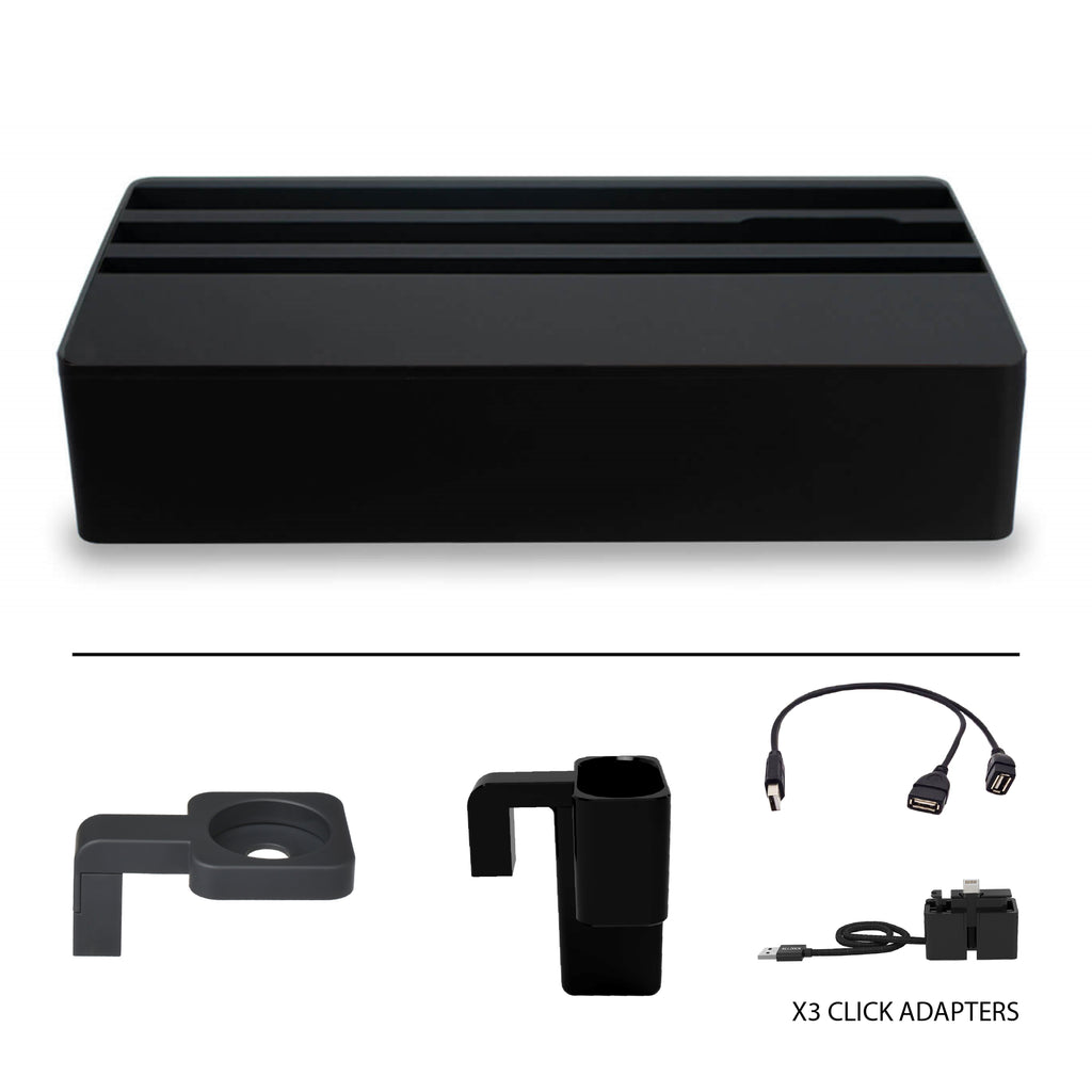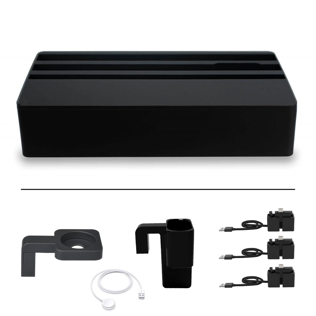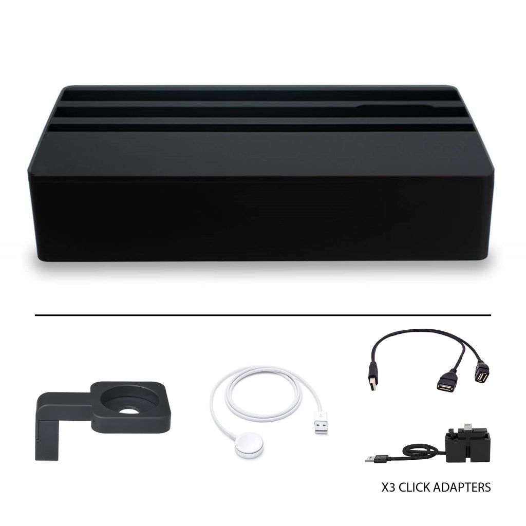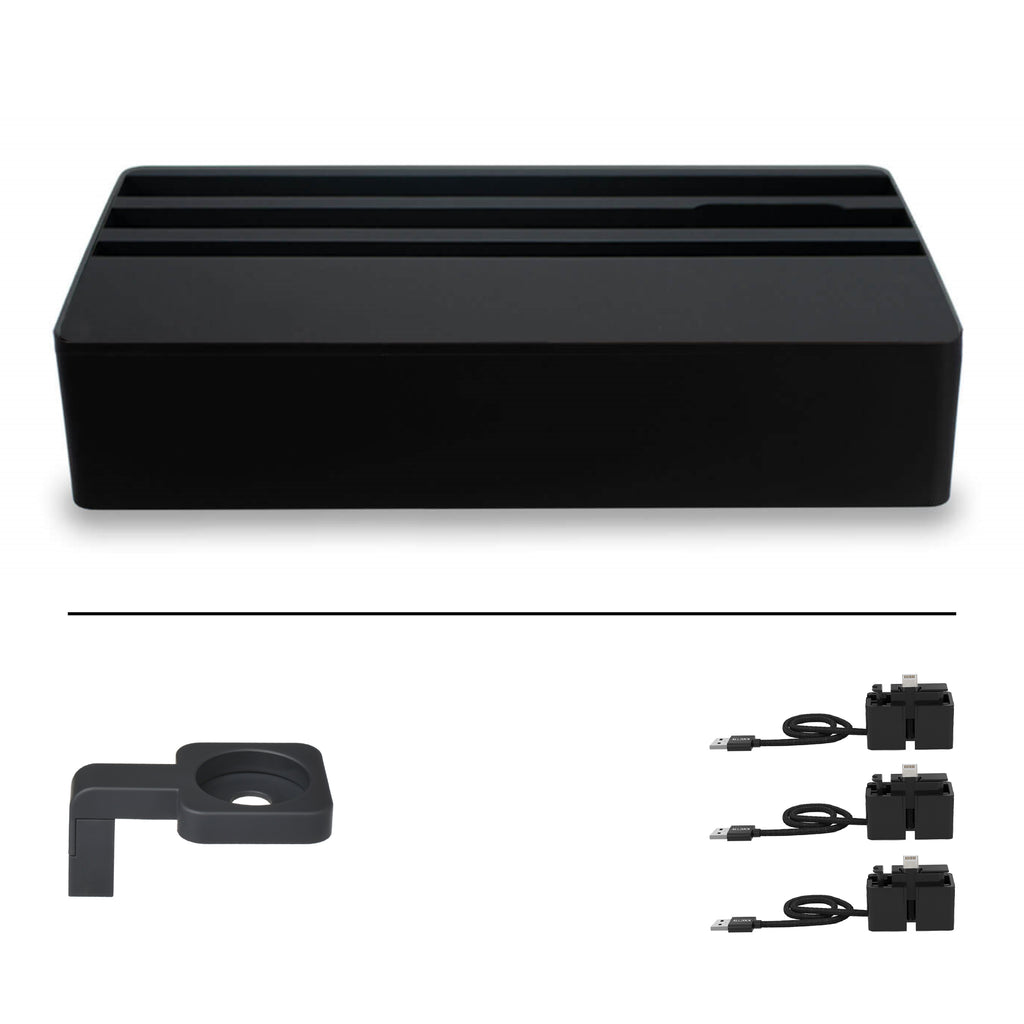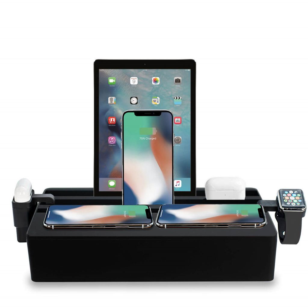 The charging station contains everything you need for charging: Two charging spots for wireless charging (Qi) and 4 spare Ports for every other cable charged device.