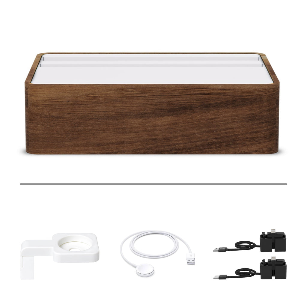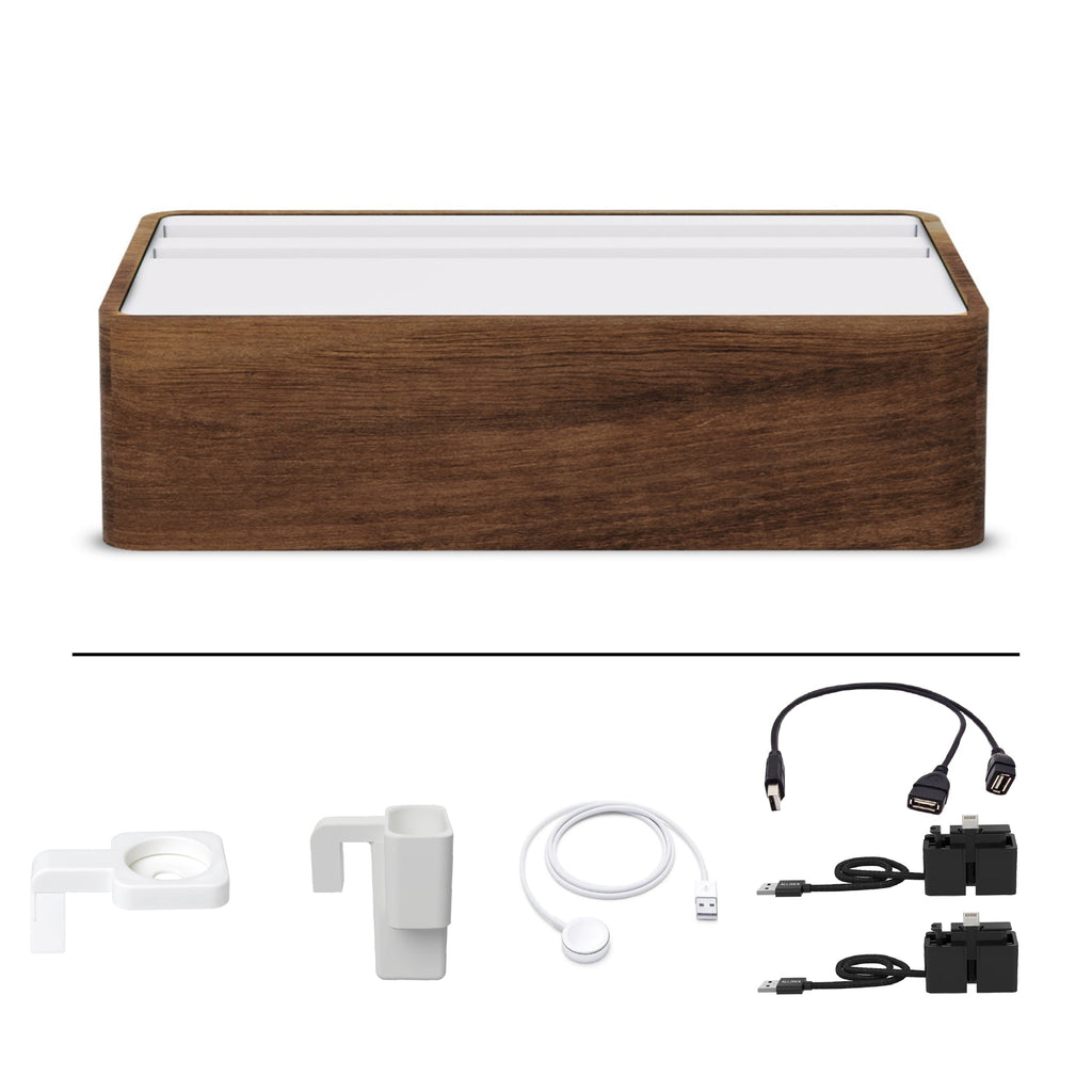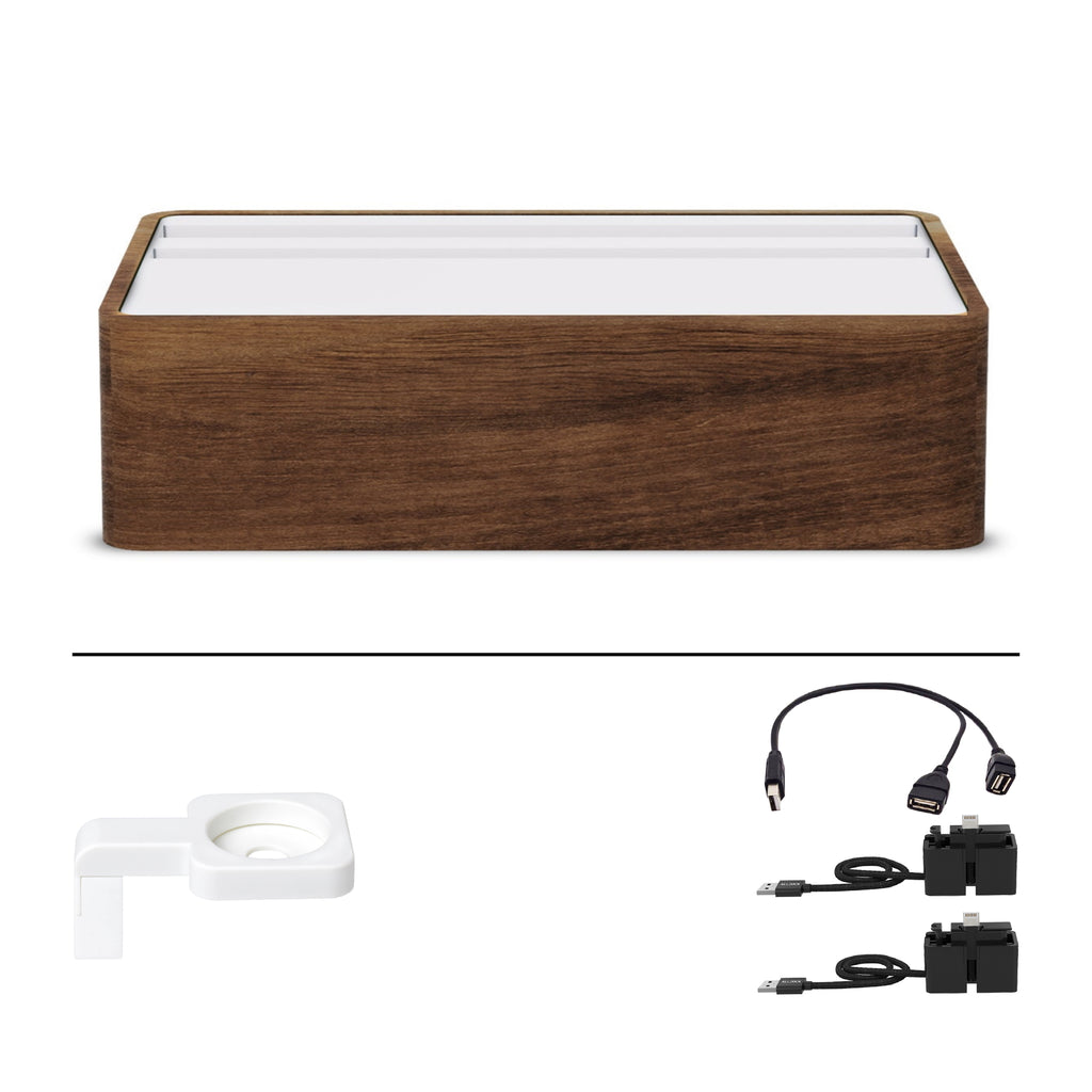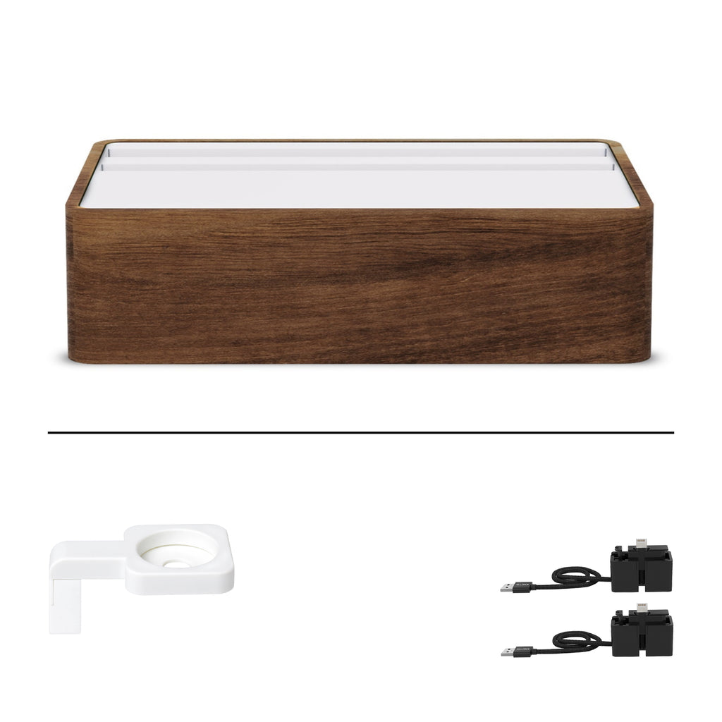 The ALLDOCK Wireless Natural FSC Walnut & White Soft Touch is a unique 4-port charging station that combines wired and wireless mobile device charging. The patented design is timelessly beautiful and all cables are hidden inside the ALLDOCK. With cables installed, you can easily dock smartphones or tablets or place them on the wireless charging spots in the front. ALLDOCK charges all devices quickly and safely.