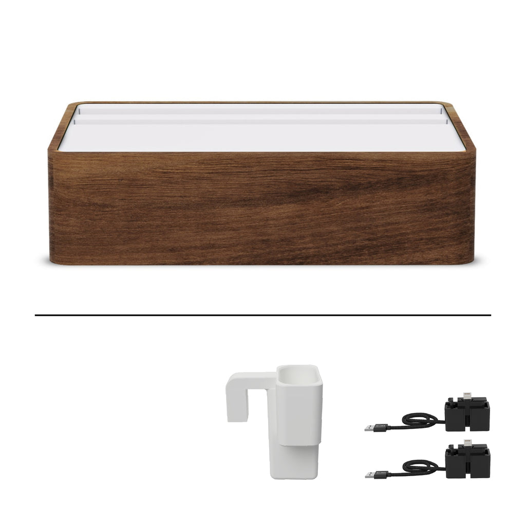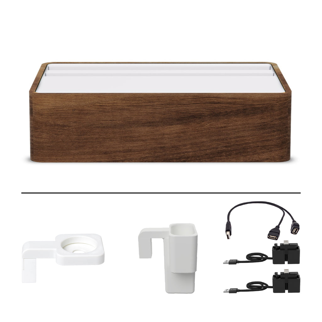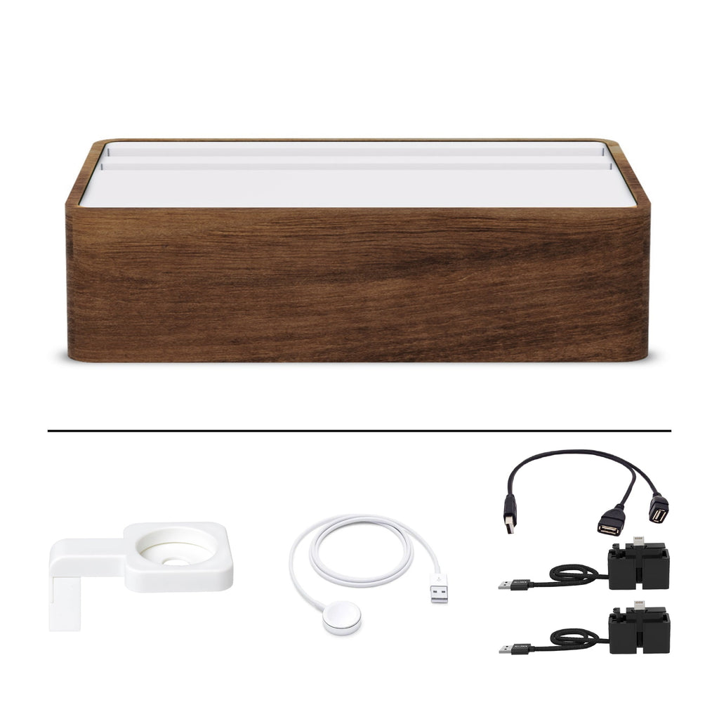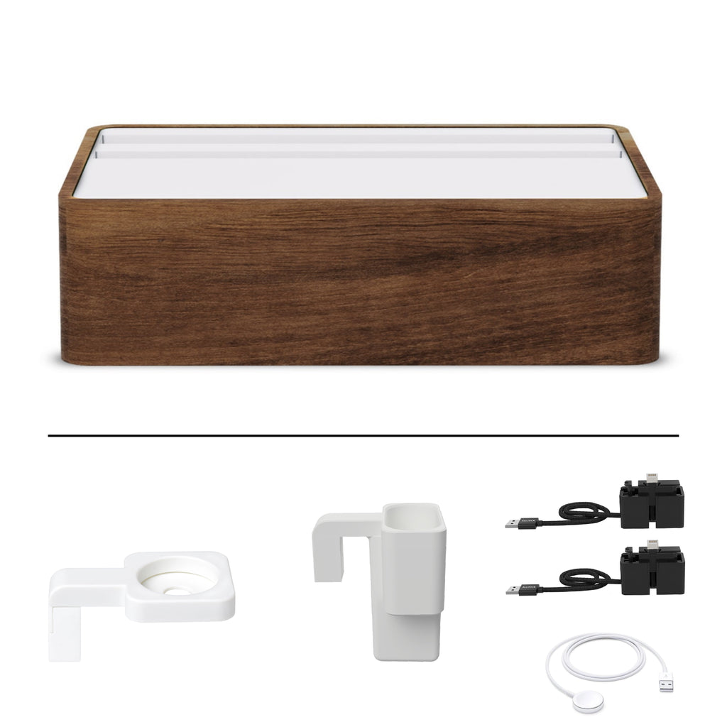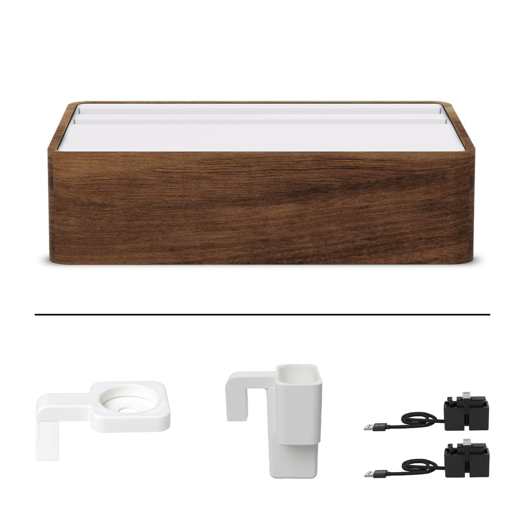 The ALLDOCK Wireless Natural FSC Walnut & White Soft Touch is a unique 4-port charging station that combines wired and wireless mobile device charging. The patented design is timelessly beautiful and all cables are hidden inside the ALLDOCK. With cables installed, you can easily dock smartphones or tablets or place them on the wireless charging spots in the front. ALLDOCK charges all devices quickly and safely.