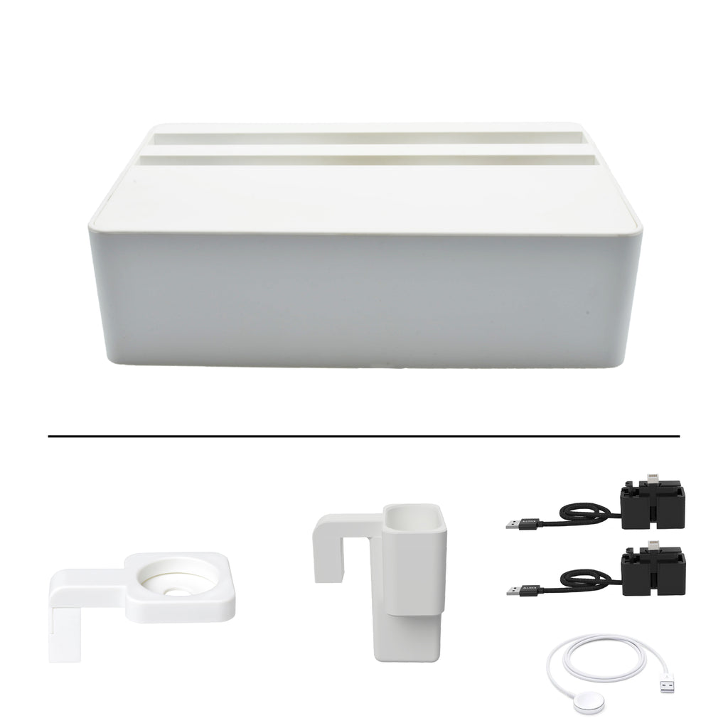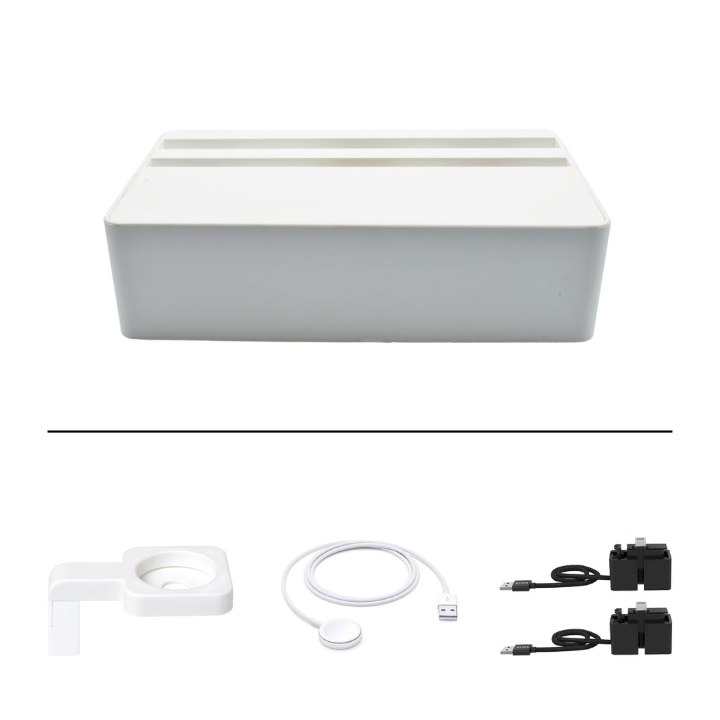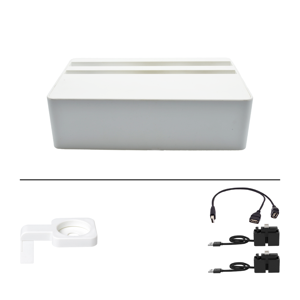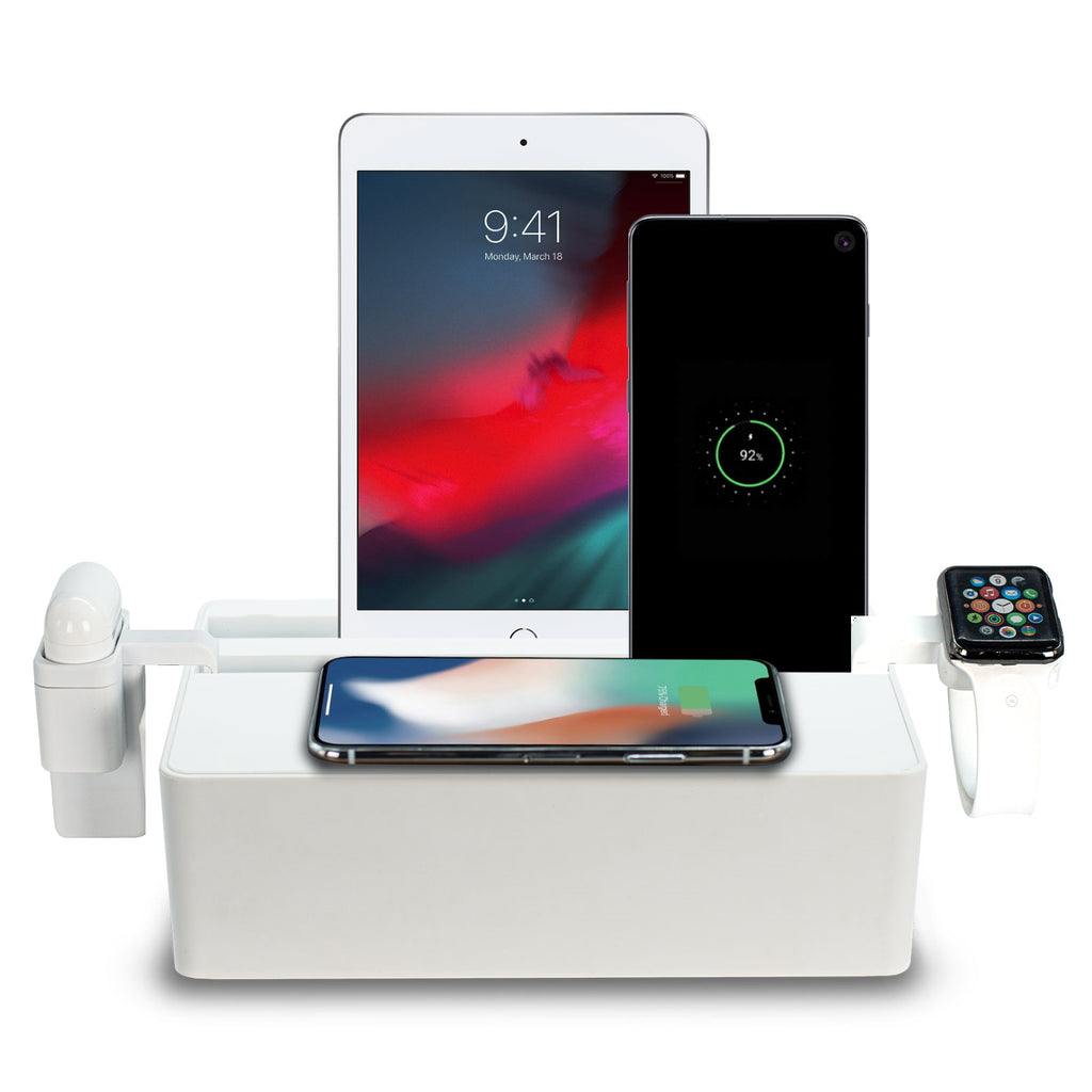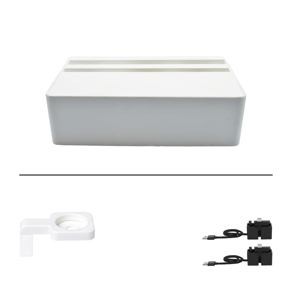 The ALLDOCK Wireless White Soft Touch is a unique 4-port charging station that combines wired and wireless mobile device charging. The patented design is timelessly beautiful and all cables are hidden inside the ALLDOCK. With cables installed, you can easily dock smartphones or tablets or place them on the wireless charging spots in the front. ALLDOCK charges all devices quickly and safely.