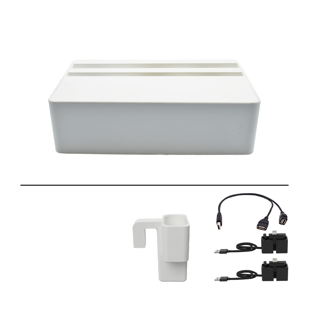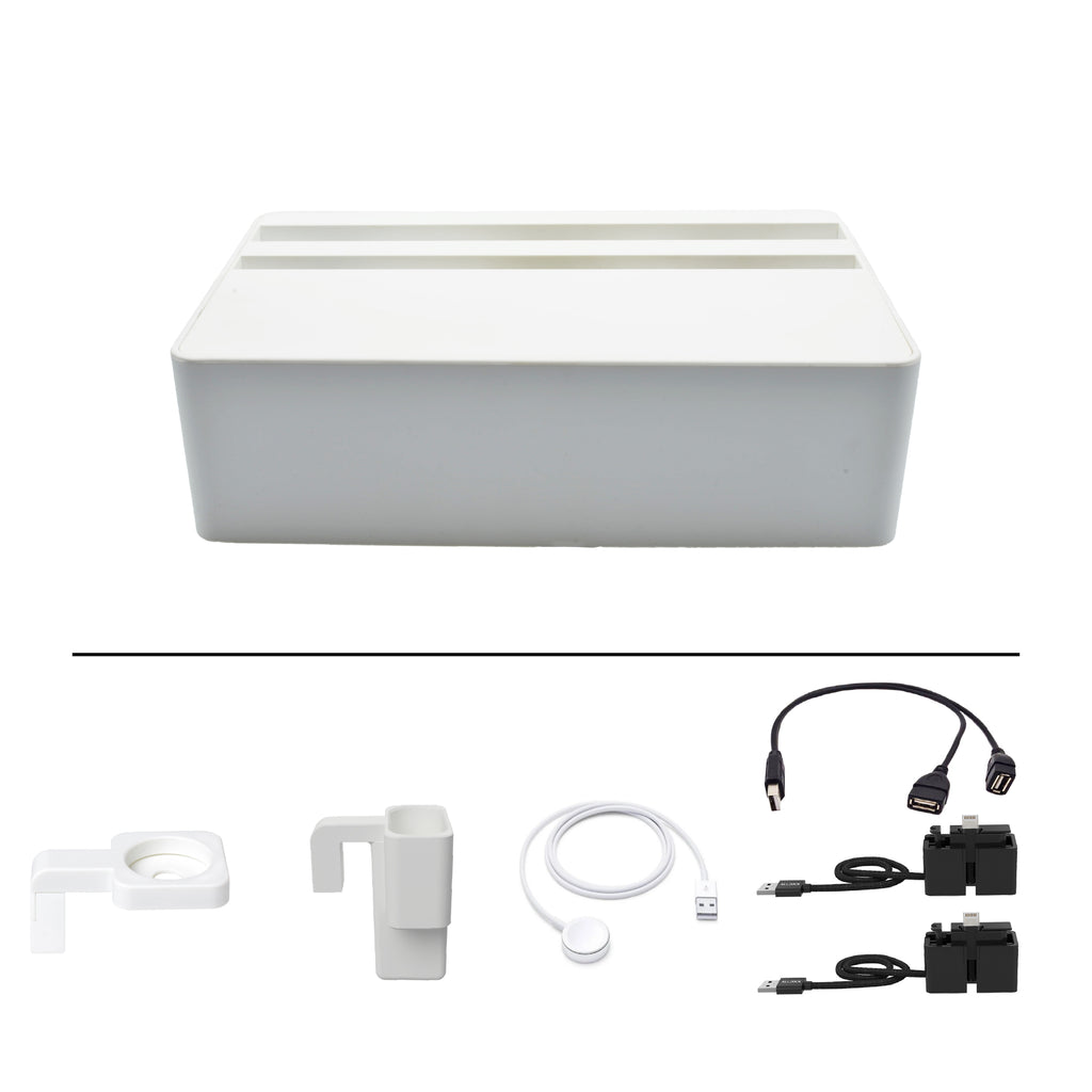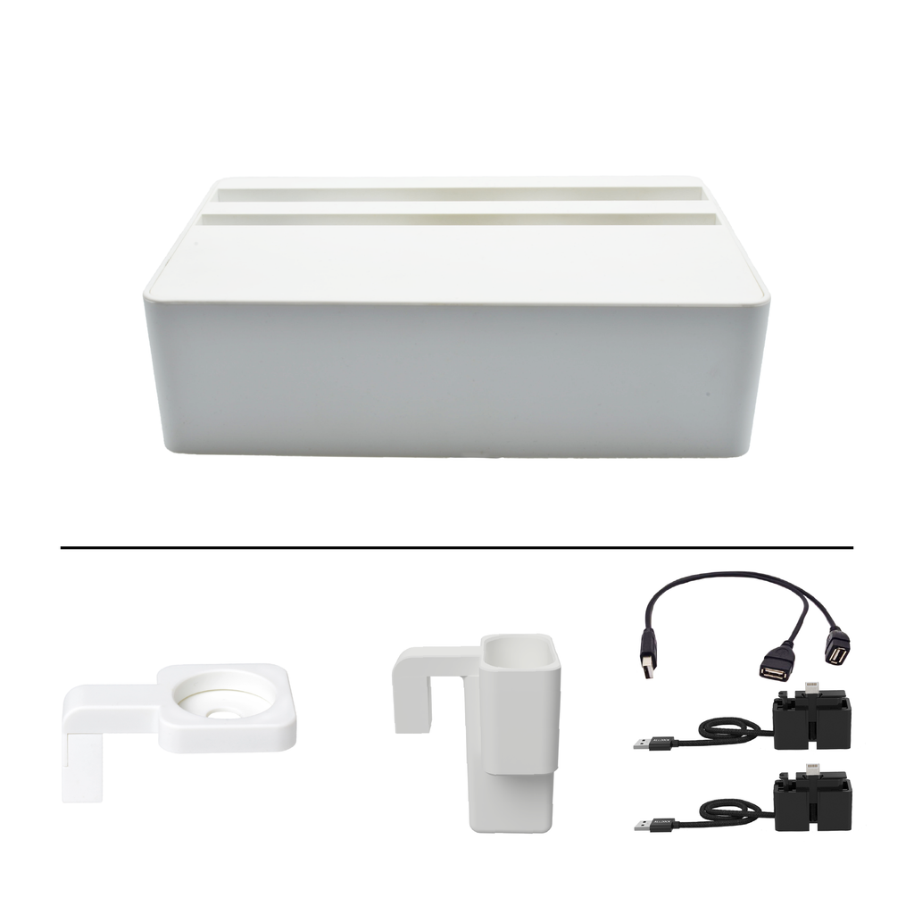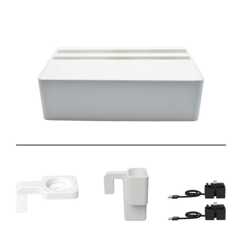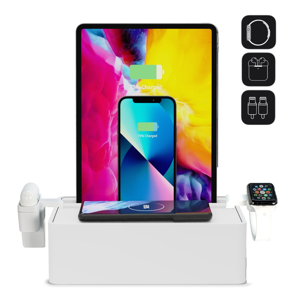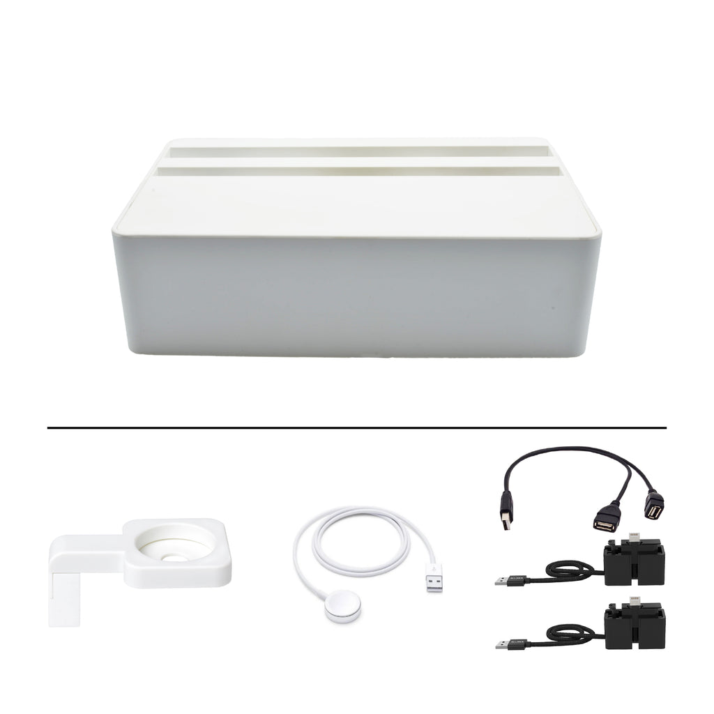 The ALLDOCK Wireless White Soft Touch is a unique 4-port charging station that combines wired and wireless mobile device charging. The patented design is timelessly beautiful and all cables are hidden inside the ALLDOCK. With cables installed, you can easily dock smartphones or tablets or place them on the wireless charging spots in the front. ALLDOCK charges all devices quickly and safely.